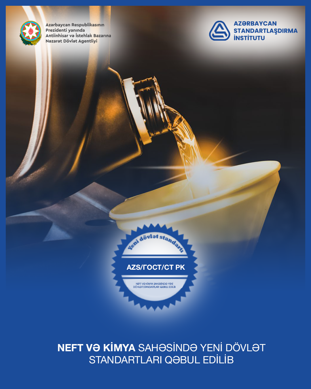 Azərbaycan Respublikasının Prezidenti yanında Antiinhisar və İstehlak Bazarına Nəzarət Dövlət Agentliyinin tabeliyində olan Azərbaycan Standartlaşdırma İnstitutu (AZSTAND) tərəfindən neft və kimya sahəsində 8 yeni dövlət standartı qəbul edilib: